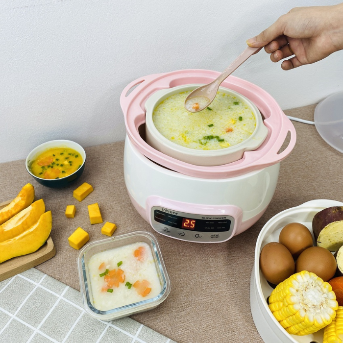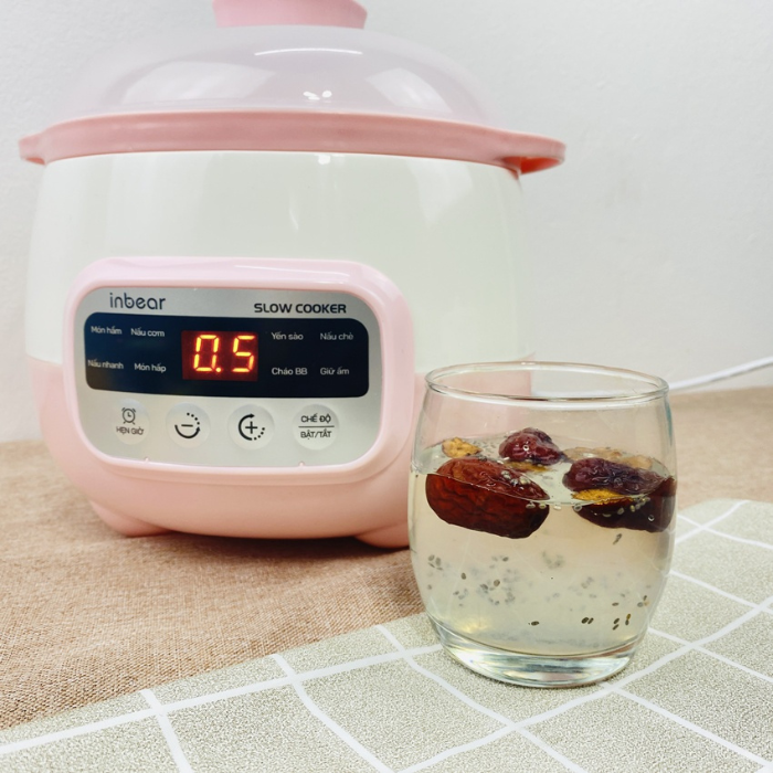ƯU ĐIỂM NỔI BẬT CỦA NỒI NẤU CHẬM INBEAR: + 8 chế độ nấu: Nấu cháo, món hầm, nấu cơm, món hấp, yến sào, nấu chè, nấu nhanh, giữ ấm. + Công nghệ hầm cách thủy làm nóng thức ăn từ từ, giữ nguyên cấu trúc dinh dưỡng của thực phẩm. + Chống trào, chống dính đáy nồi. + Lõi gốm sứ tự nhiên cao cấp, giữ và truyền nhiệt đều. + Hẹn giờ dễ dàng, từ nấu nhanh/ chậm đến giữ ấm tự động tới 9.5h. + Có khay hấp đi kèm, 1 lần nấu được 2 món khác nhau, tiện lợi và tiết kiệm thời gian. + Dung tích 1,6L phù hợp cho gia đình hoặc nấu đồ ăn cho bé. + Hầm cháo ngon sánh mịn, không bị nhão + Ninh xương, hầm gà mềm nhừ, chiết xuất tối đa chất dinh dưỡng. + Chưng yến, nấu chè nở bung, thơm ngon, giữ trọn hương vị, dưỡng chất sẵn có.