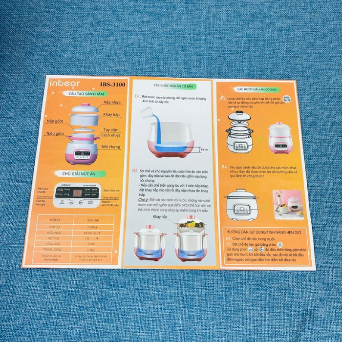 THÔNG TIN VỀ NỒI NẤU CHÁO CHẬM INBEAR + Model: IBS-3100 + Thể tích: 1,6L thố sứ + 1,5L khay hấp + Công suất: 220W + Dòng điện: 220-240V + Trọng lượng: 2,4kg